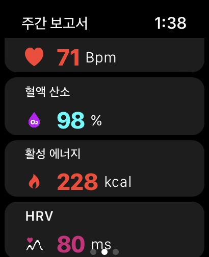 애플워치 상에서 보여지는 정보는 아래와 같으며 대다수 '1편] 애플워치에서 스트레스 측정이 가능하다?' 로 안내드린 앱 GZ Heart와 동일하지만 Health Watcher: Heart & Stress 앱에서는 주간보고서를 추가로 제공하고 있습니다 :)