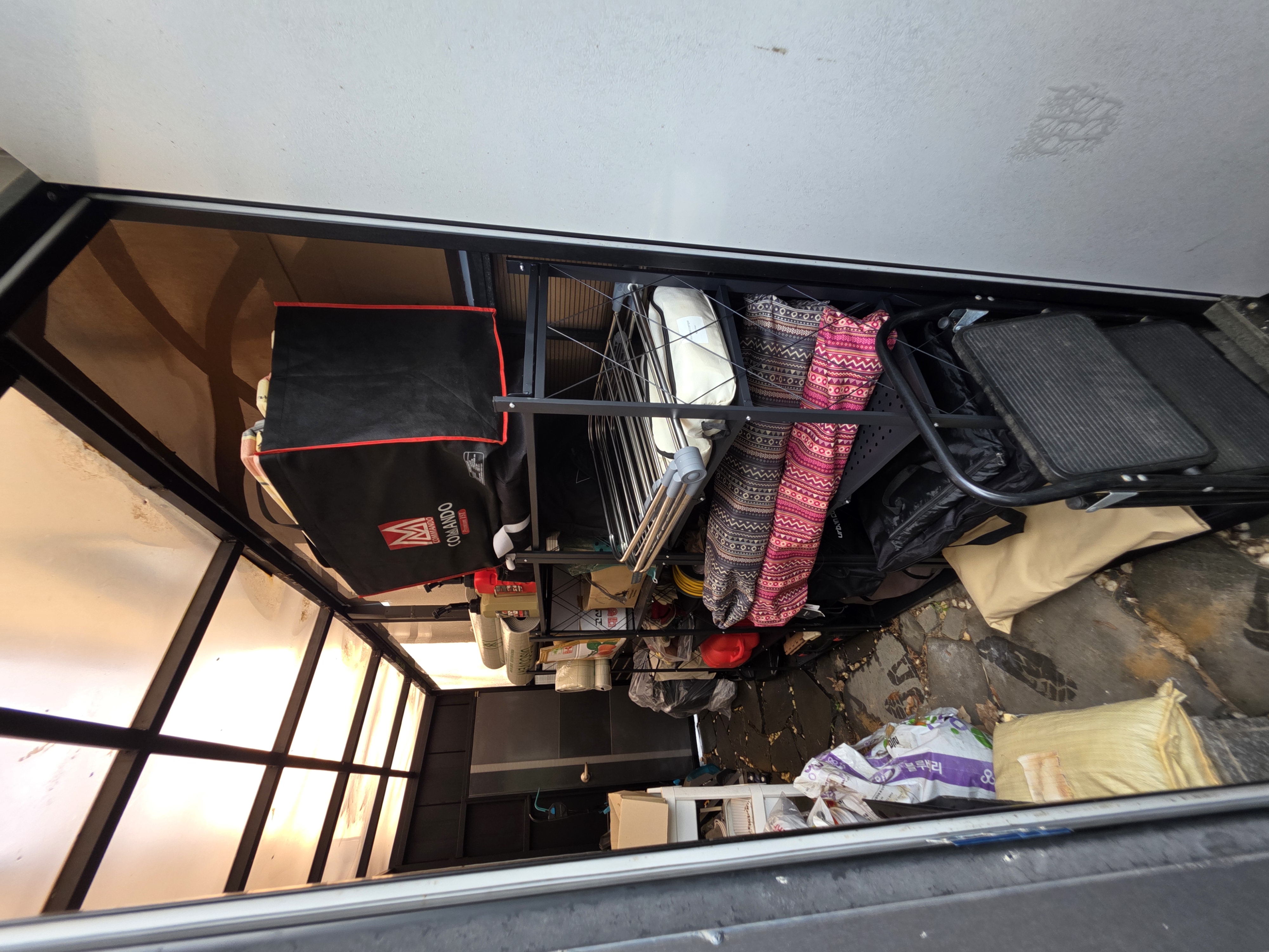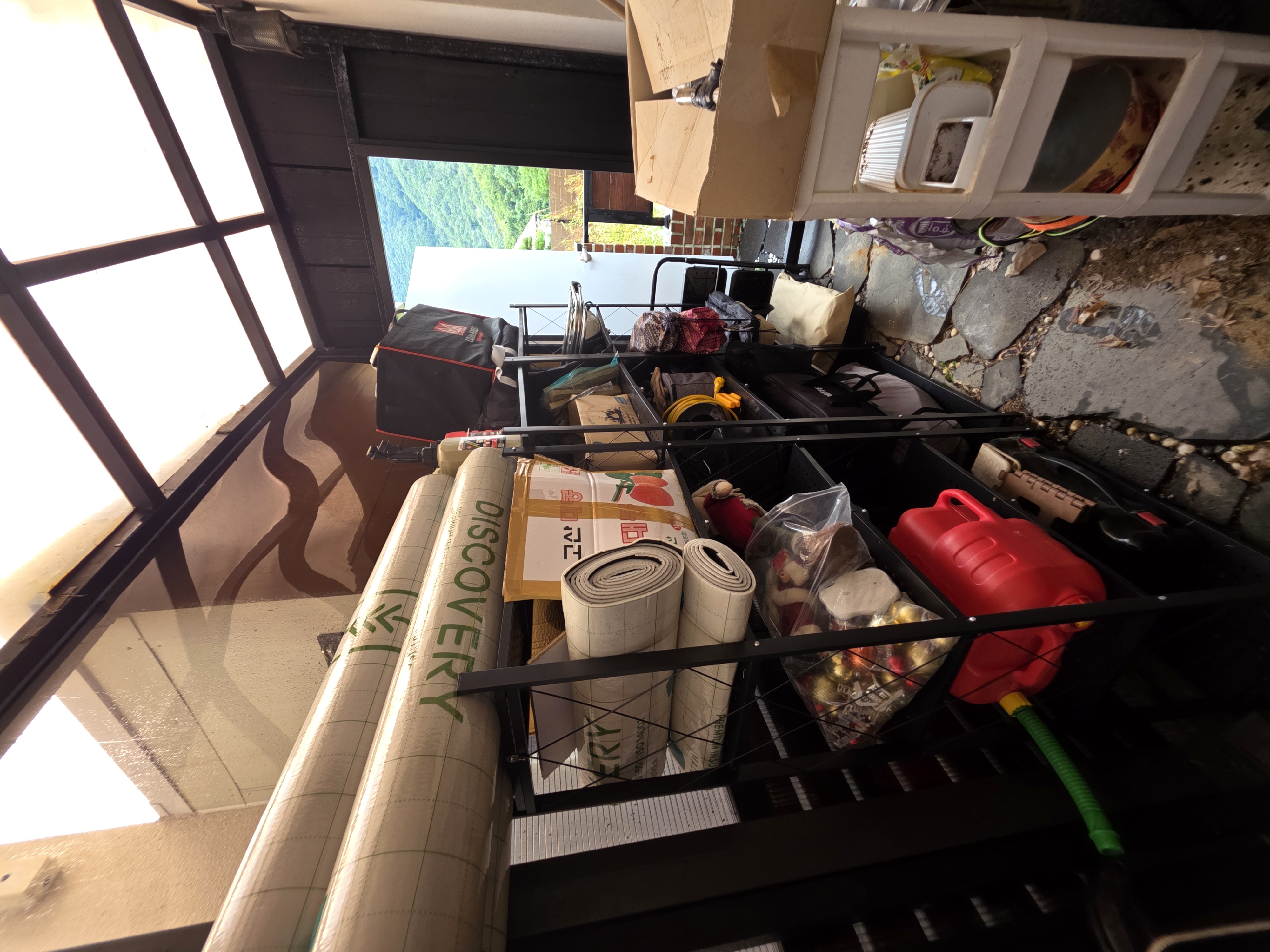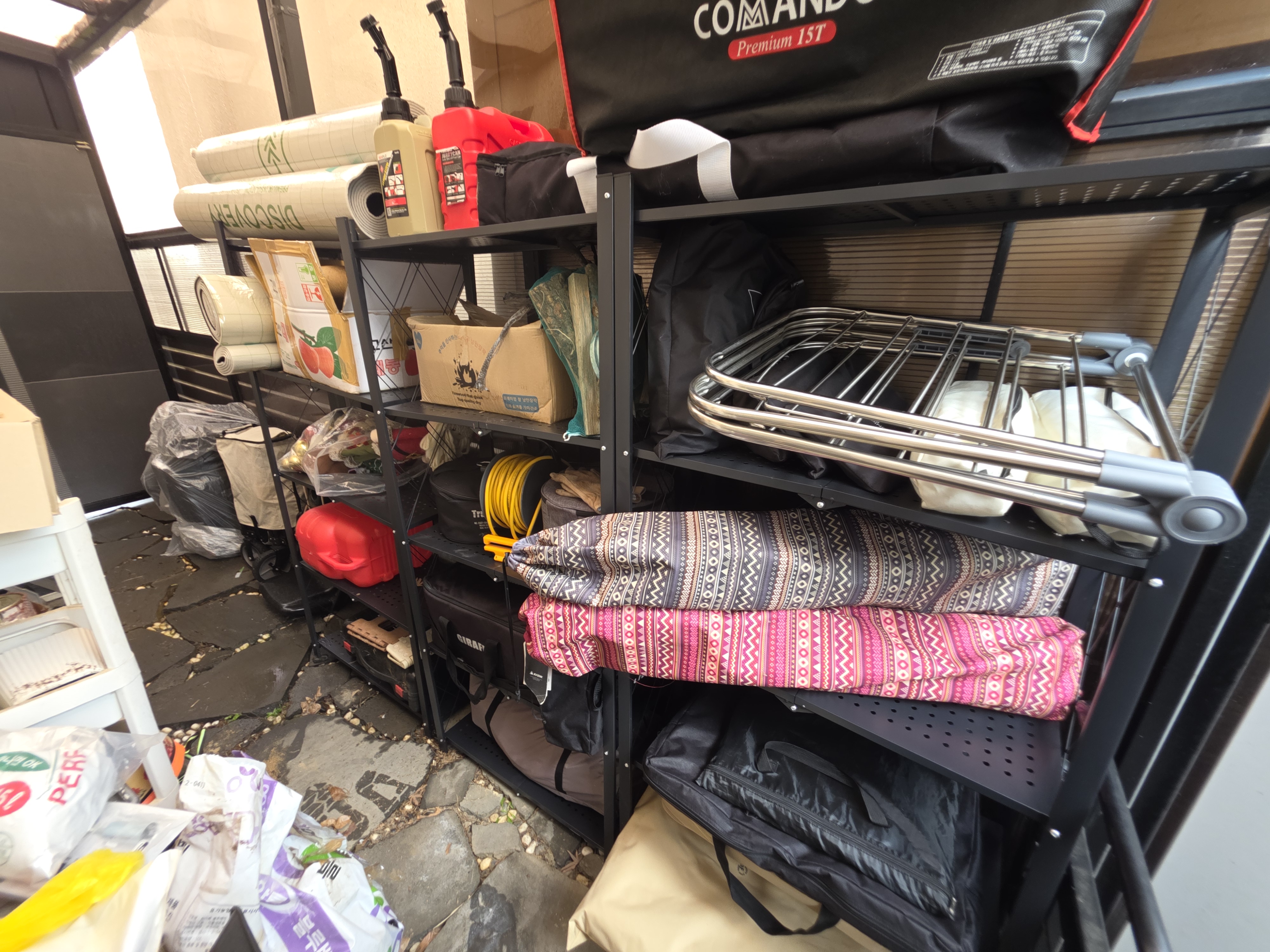 이제 제일 신나는 시간! 바닥에 나뒹굴던 캠핑 용품들을 차곡차곡 정리해서 선반에 올리니, 속이 다 시원하더라. 이제 바닥 습기 걱정, 곰팡이 걱정은 진짜 끝!